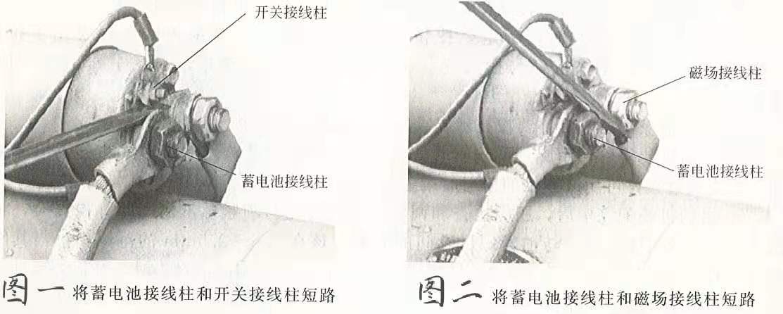 6.用旋具再將蓄電池接線柱和磁場接線柱短路。若啟動機(jī)正常運轉(zhuǎn),則說明電磁開關(guān)內(nèi)部有故障,應(yīng)拆下電磁開關(guān),檢查電磁開關(guān)內(nèi)部的活動觸頭和兩個靜觸頭的燒損情況及磁力線圈是否燒損等。如啟動機(jī)仍不運轉(zhuǎn),且在短路時無火花出現(xiàn),則說明啟動機(jī)內(nèi)部出現(xiàn)斷路故障;若火花出現(xiàn),則說明啟動機(jī)內(nèi)部出現(xiàn)短路現(xiàn)象,應(yīng)將啟動機(jī)拆下后進(jìn)行修理。