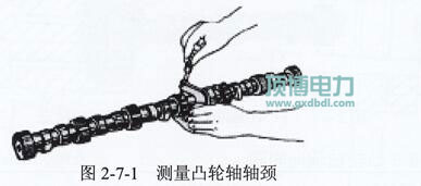 (1)測(cè)量凸輪軸軸徑,各機(jī)型凸輪軸徑規(guī)定值見(jiàn)表2-7-1。測(cè)量方法見(jiàn)圖2-7-1。